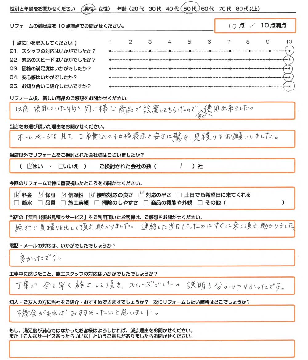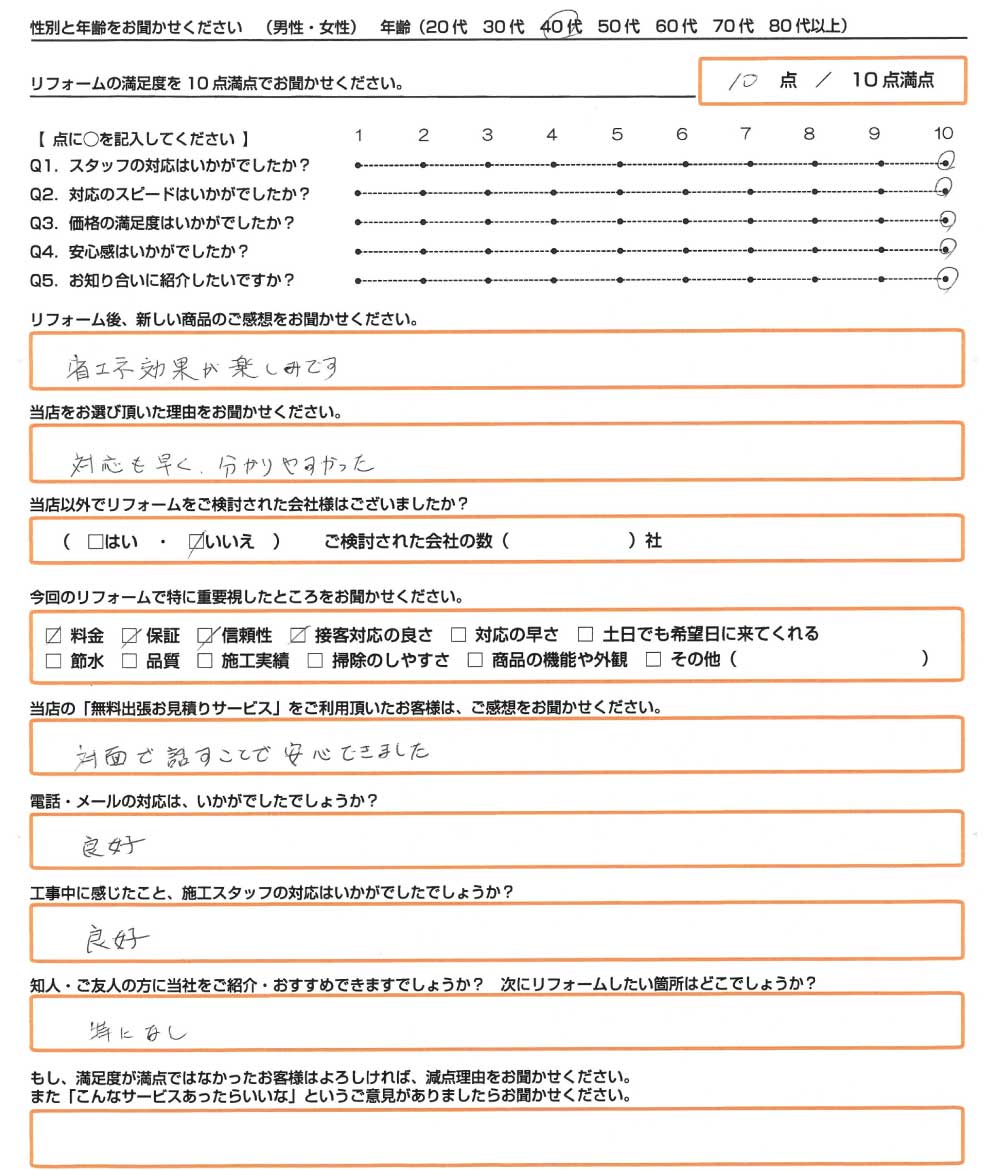 直筆のアンケート リフォーム情報 施工日:2023年10月17日 場所:加古川市 リフォーム内容:エコキュート取替 使用したモデル:HE-S46LQS お客様情報性別・年齢:男性(40代) リフォームの満足度10点/10 ...