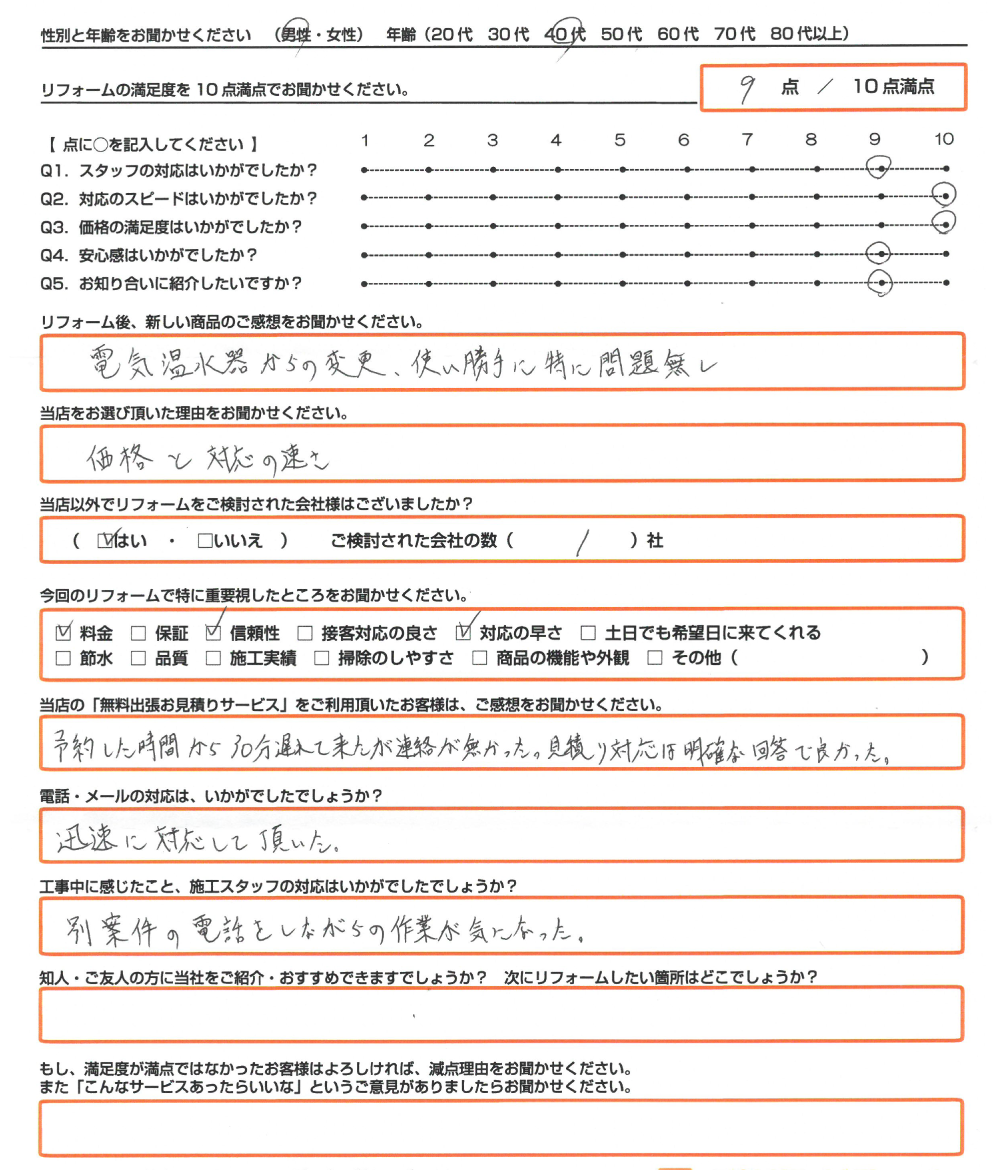 直筆のアンケートリフォーム情報施工日:2020年8月19日場所:神戸市リフォーム内容:電機温水器からエコキュート入替使用したモデル:お客様情報性別・年齢:男性(40代)リフォームの満足度10点/10点満点中アンケートの内 ...