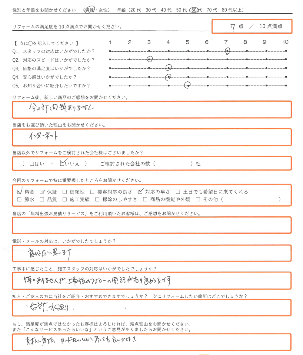 直筆のアンケートリフォーム情報施工日:2020年7月9日場所:加古郡リフォーム内容:エコキュート入替使用したモデル:お客様情報性別・年齢:男性(60代)リフォームの満足度7点/10点満点中アンケートの内容リフォーム後、新 ...