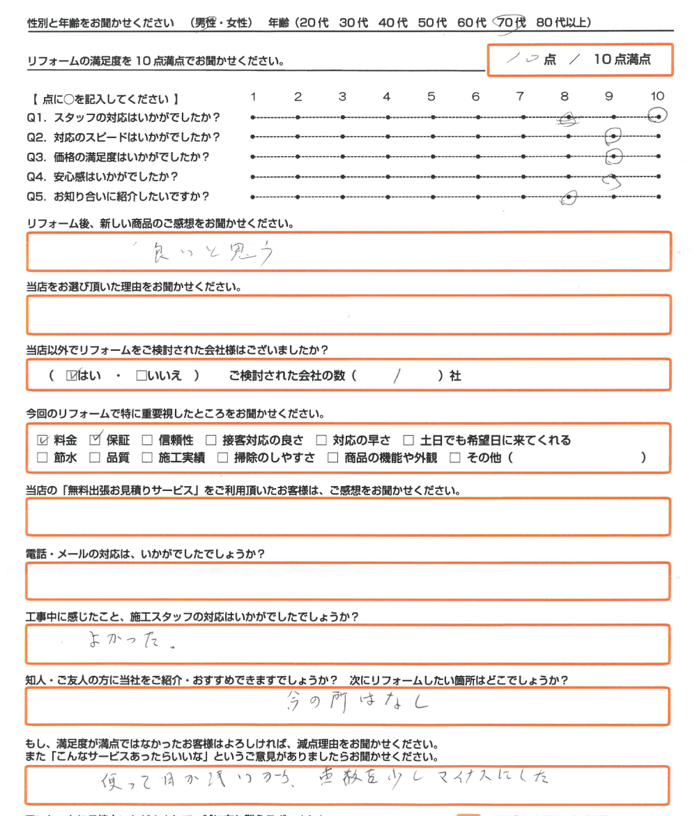 直筆のアンケートリフォーム情報施工日:2020年7月31日場所:姫路市リフォーム内容:エコキュート・IH交換使用したモデル:お客様情報性別・年齢: (70代)リフォームの満足度9点/10点満点中アンケートの内容リフォー ...