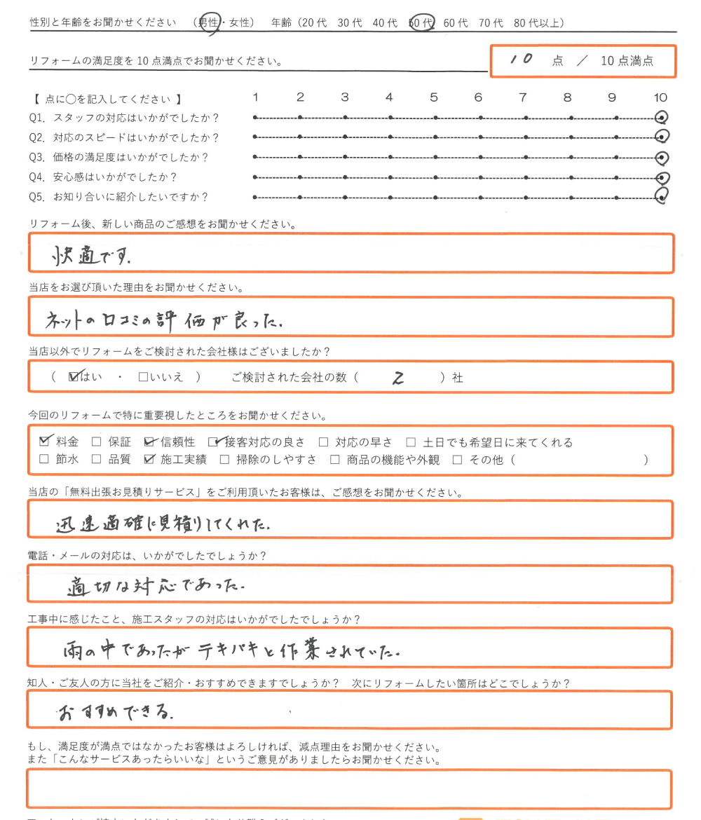直筆のアンケートリフォーム情報施工日:2020年7月15日場所:岡山市リフォーム内容:エコキュート交換使用したモデル:お客様情報性別・年齢:男性(50代)リフォームの満足度10点/10点満点中アンケートの内容リフォーム後 ...