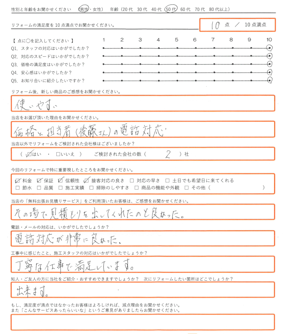 直筆のアンケートリフォーム情報施工日:2020年7月20日場所:瀬戸内市リフォーム内容:エコキュート交換使用したモデル:お客様情報性別・年齢:男性(50代)リフォームの満足度10点/10点満点中アンケートの内容リフォーム ...