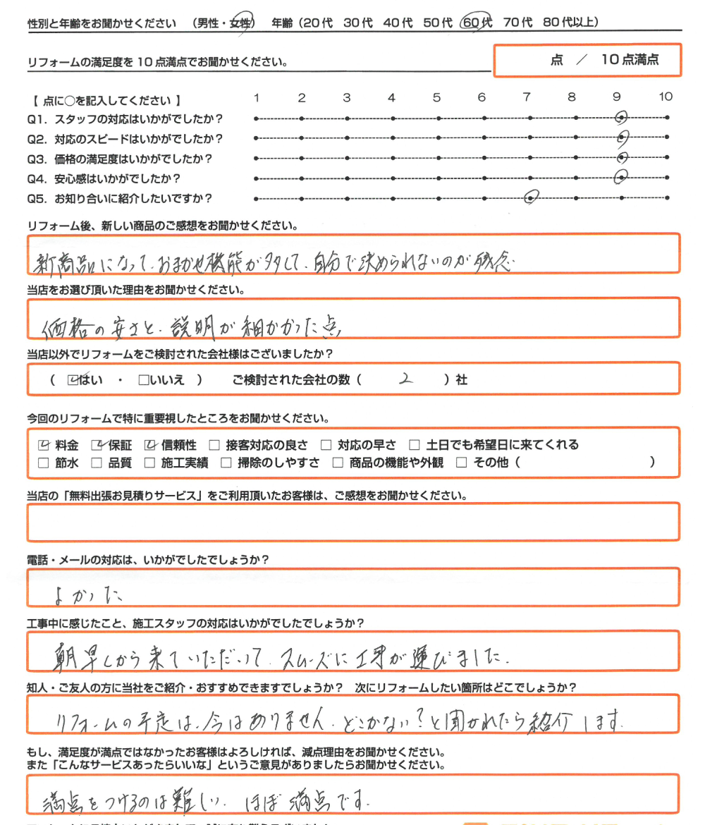 直筆のアンケートリフォーム情報施工日:2020年7月22日場所:神戸市リフォーム内容:薄型エコキュート交換使用したモデル:お客様情報性別・年齢:女性(60代)リフォームの満足度9点/10点満点中アンケートの内容リフォーム ...