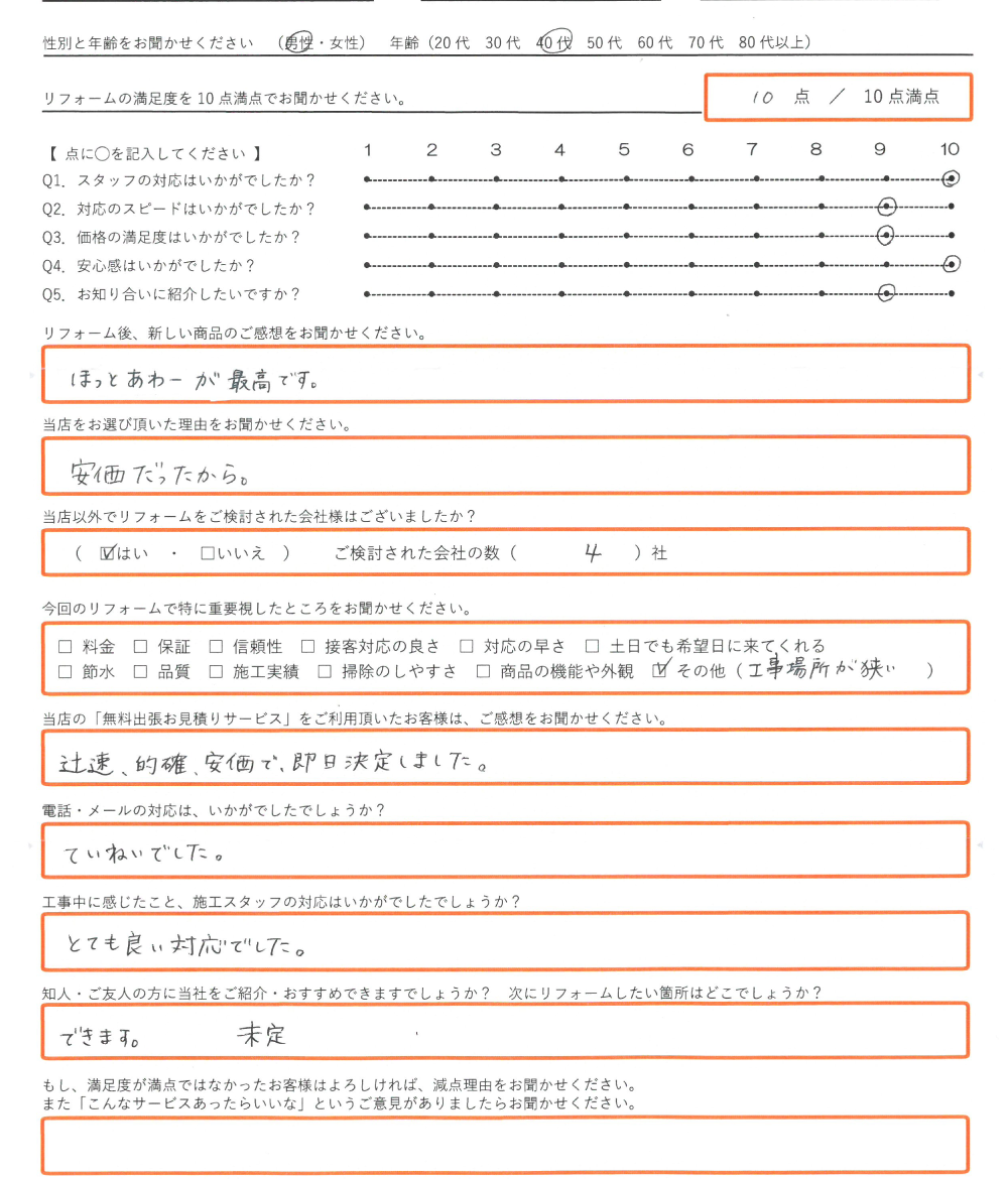 直筆のアンケートリフォーム情報施工日:2020年6月9日場所:岡山リフォーム内容:エコキュート入替使用したモデル:お客様情報性別・年齢: 男性(40代)リフォームの満足度10点/10点満点中アンケートの内容リフォーム後、 ...