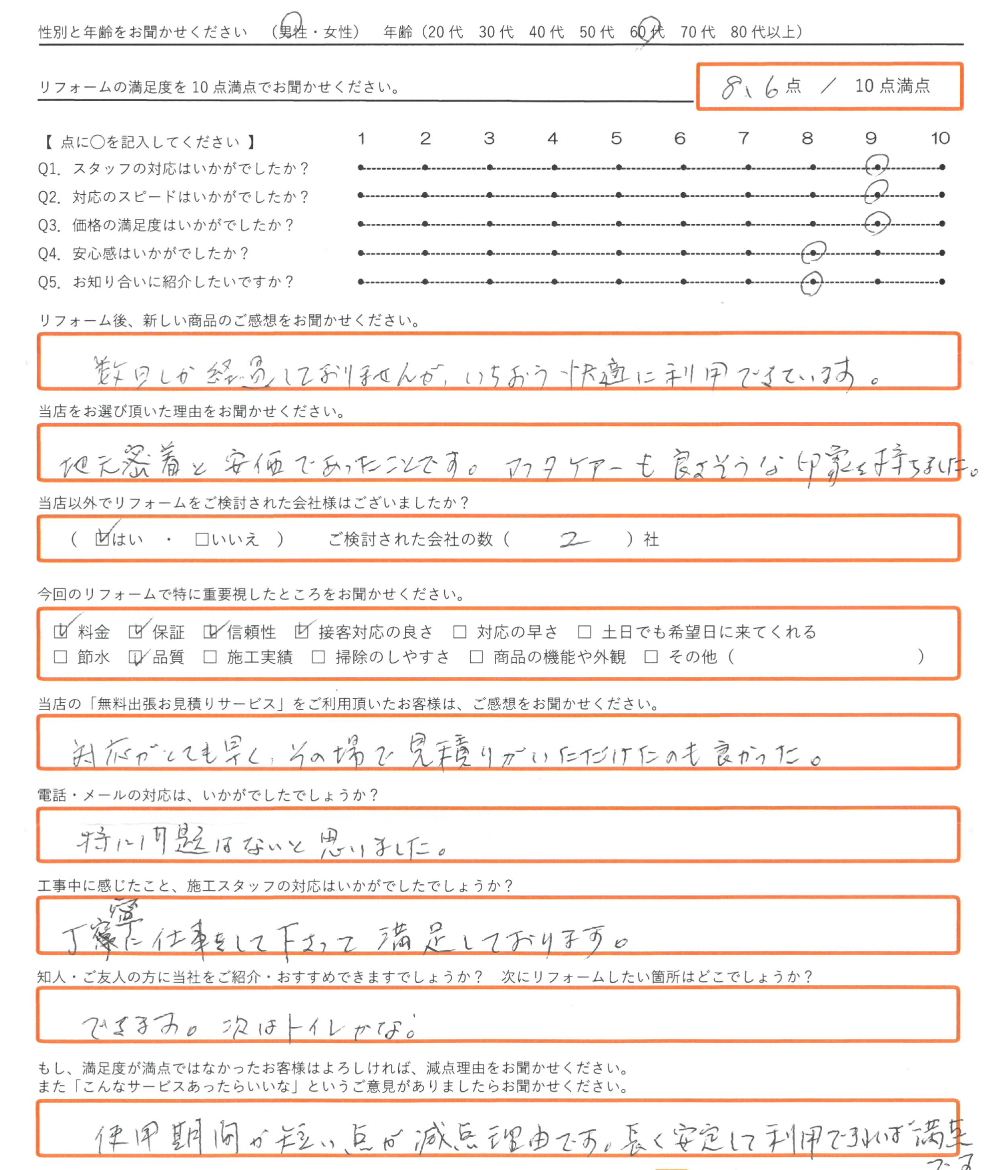 直筆のアンケートリフォーム情報施工日:2020年5月29日場所:岡山市リフォーム内容:エコキュート交換使用したモデル:お客様情報性別・年齢: 男性(60代)リフォームの満足度8.6点/10点満点中アンケートの内容リフォー ...
