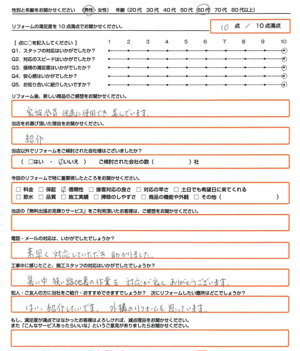 直筆のアンケートリフォーム情報施工日:2020年6月2日場所:加古川市リフォーム内容:エコキュート交換使用したモデル:お客様情報性別・年齢:男性60代)リフォームの満足度10点/10点満点中アンケートの内容リフォーム後、 ...