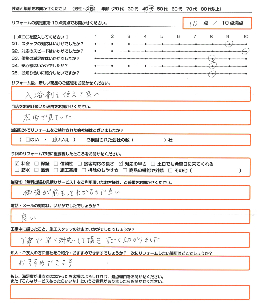 直筆のアンケートリフォーム情報施工日:2020年3月18日場所:加古川市リフォーム内容:電機温水器からエコキュート交換使用したモデル:お客様情報性別・年齢:女性(40代)リフォームの満足度10点/10点満点中アンケートの ...