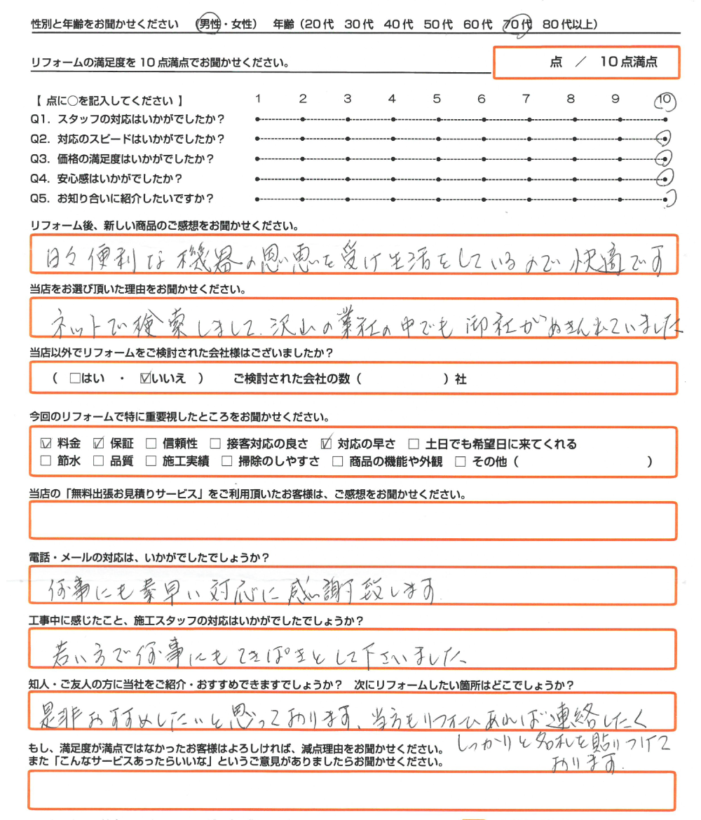 直筆のアンケートリフォーム情報施工日:2020年2月25日場所:姫路市リフォーム内容:エコキュート交換使用したモデル:お客様情報性別・年齢:男性(70代)リフォームの満足度10点/10点満点中アンケートの内容リフォーム後 ...