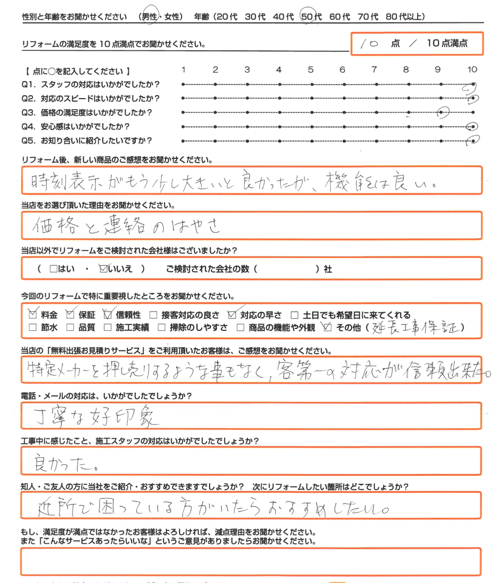 直筆のアンケートリフォーム情報施工日:2020年2月25日場所:芦屋市リフォーム内容:エコキュート交換使用したモデル:お客様情報性別・年齢:男性(50代)リフォームの満足度10点/10点満点中アンケートの内容リフォーム後 ...