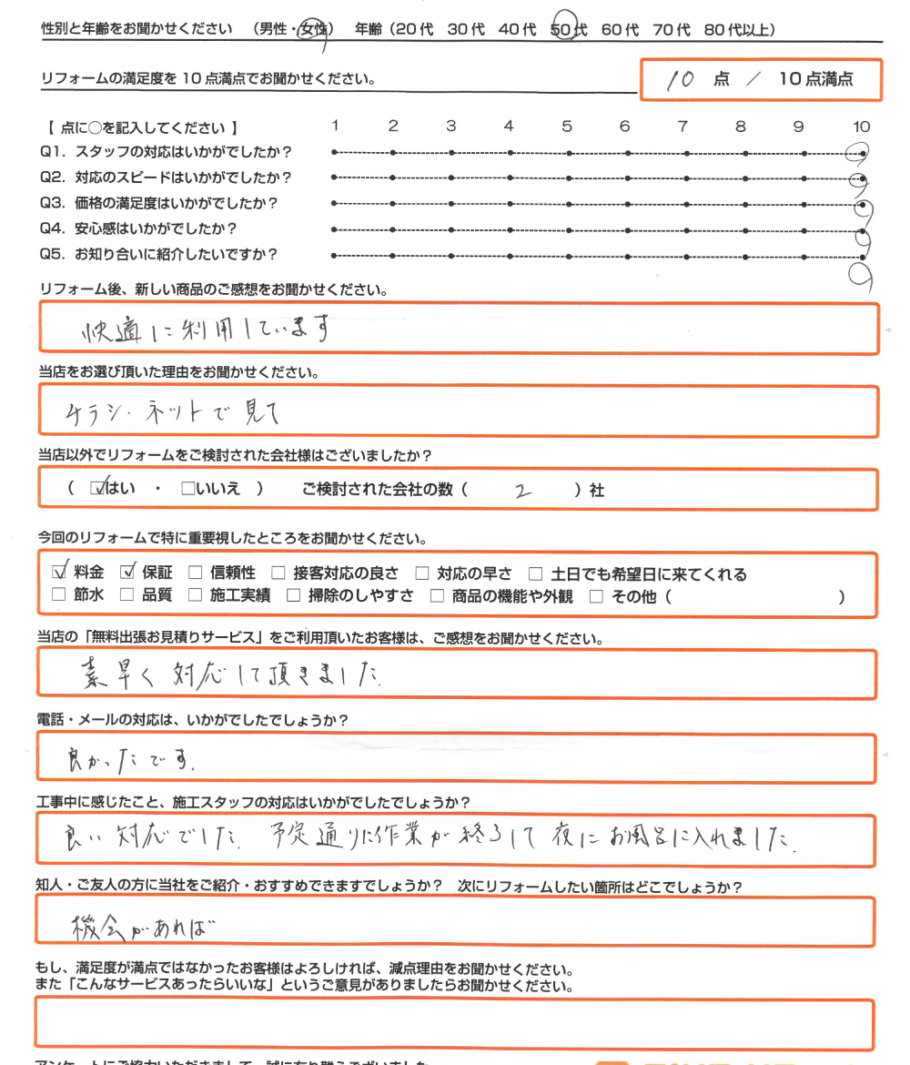直筆のアンケートリフォーム情報施工日:2020年2月7日場所:加古川市リフォーム内容:電機温水器からエコキュート使用したモデル:お客様情報性別・年齢:女性(50代)リフォームの満足度9点/10点満点中アンケートの内容リフ ...