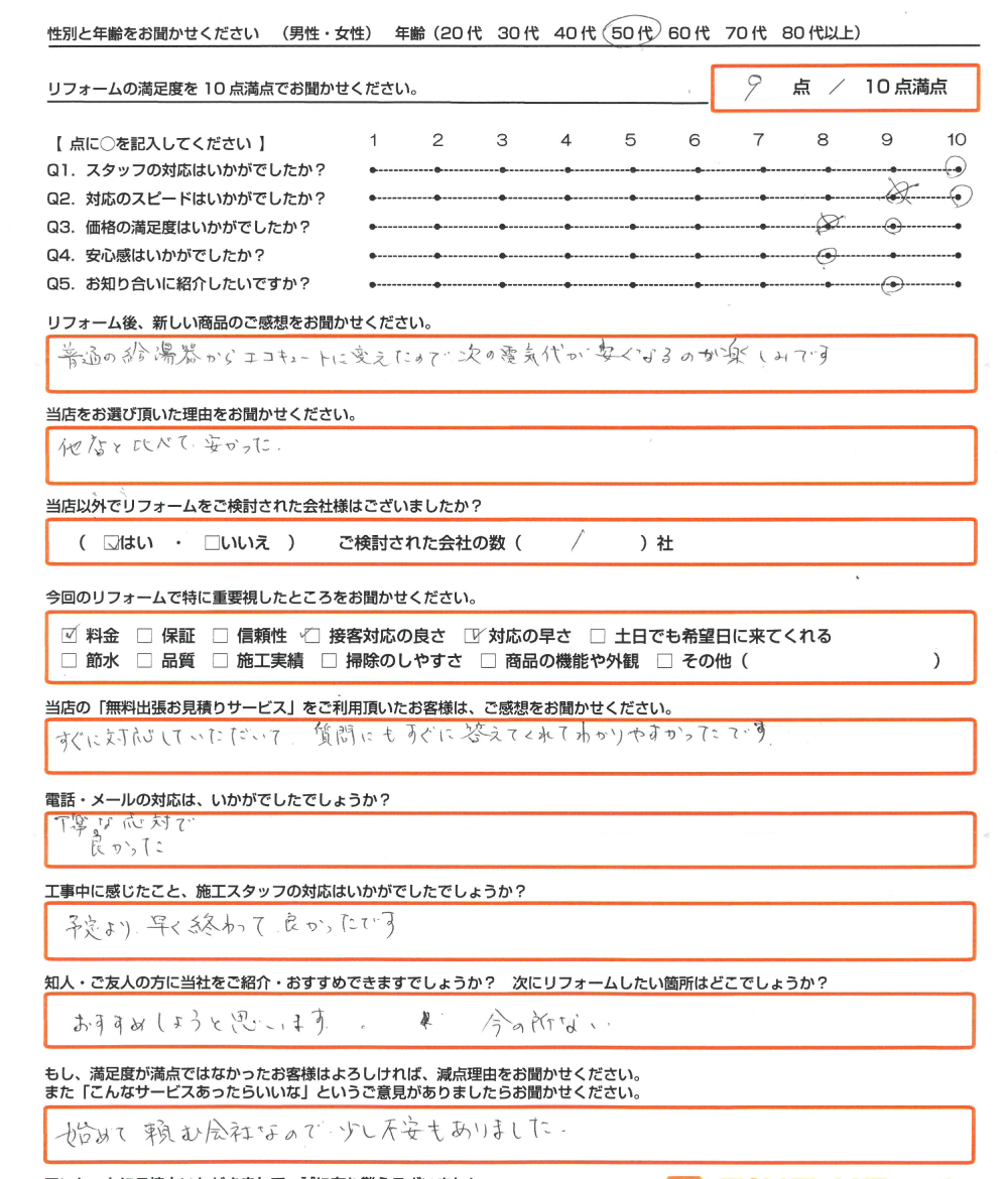 直筆のアンケートリフォーム情報施工日:2020年1月29日場所:姫路市リフォーム内容:電機温水器からエコキュート使用したモデル:お客様情報性別・年齢: (50代)リフォームの満足度9点/10点満点中アンケートの内容リフォ ...
