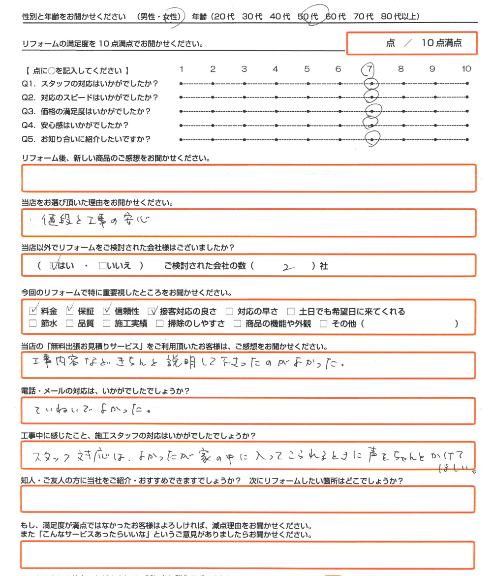 直筆のアンケートリフォーム情報施工日:2020年1月31日場所:加古川市リフォーム内容:電機温水器からエコキュート使用したモデル:お客様情報性別・年齢:女性(50代)リフォームの満足度7点/10点満点中アンケートの内容リ ...