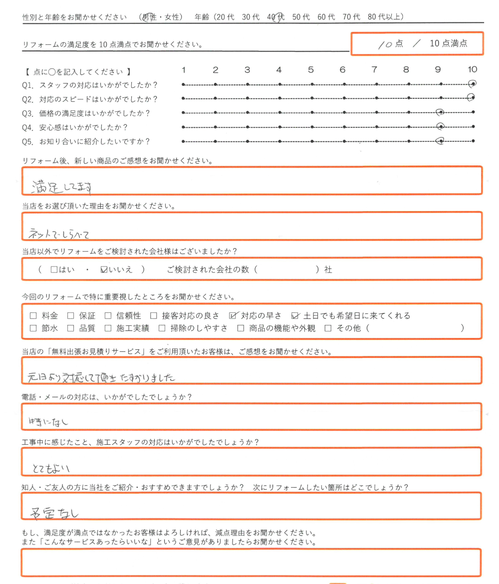 直筆のアンケートリフォーム情報施工日:2020年1月4日場所:加古川市リフォーム内容:エコキュート取替使用したモデル:お客様情報性別・年齢:男性(40代)リフォームの満足度10点/10点満点中アンケートの内容リフォーム後 ...