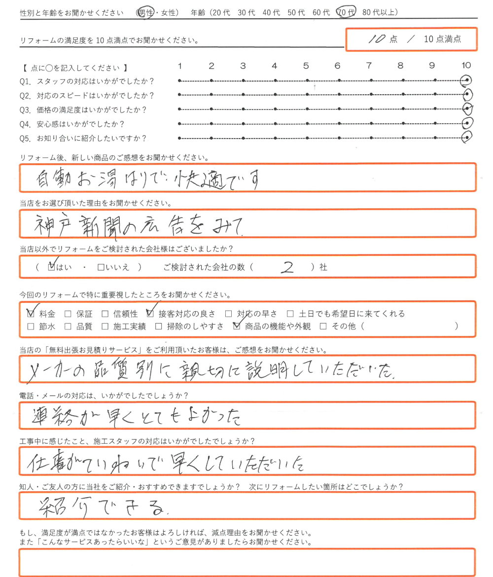 直筆のアンケートリフォーム情報施工日:2019年12月16日場所:神戸市リフォーム内容:エコキュート交換使用したモデル:お客様情報性別・年齢:男性(70代)リフォームの満足度10点/10点満点中アンケートの内容リフォーム ...