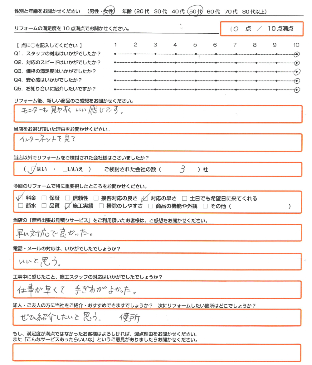 直筆のアンケートリフォーム情報施工日:2019年11月28日場所:姫路市リフォーム内容:エコキュート交換使用したモデル:お客様情報性別・年齢:女性(50代)リフォームの満足度10点/10点満点中アンケートの内容リフォーム ...