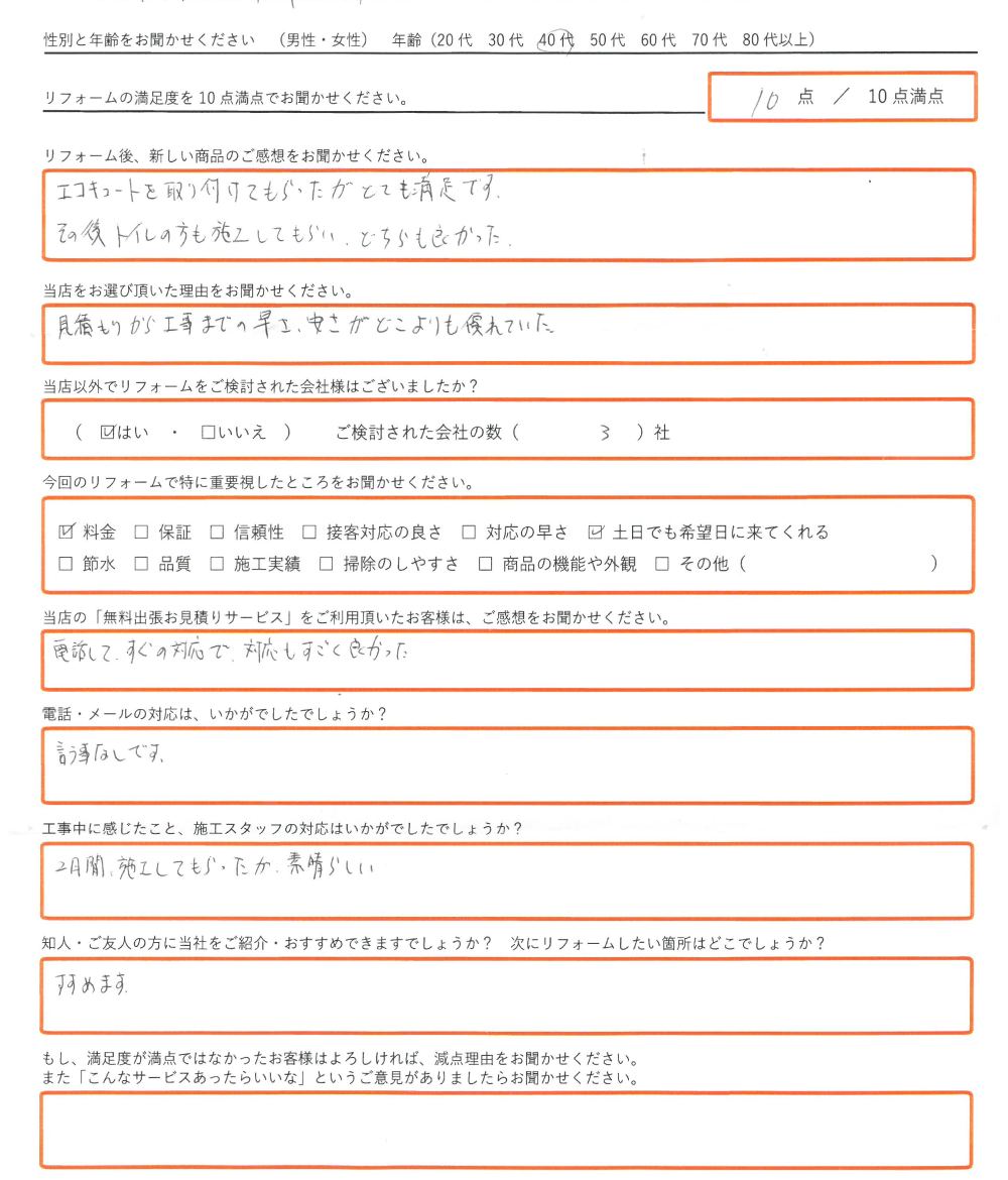 直筆のアンケートリフォーム情報施工日:2019年11月28日場所:たつの市リフォーム内容:トイレ・エコキュート入替使用したモデル:お客様情報性別・年齢: (40代)リフォームの満足度10点/10点満点中アンケートの内容 ...
