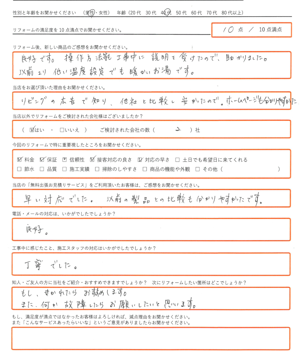 直筆のアンケートリフォーム情報施工日:2019年11月27日場所:加古川市リフォーム内容:エコキュート交換使用したモデル:お客様情報性別・年齢:男性(40代)リフォームの満足度10点/10点満点中アンケートの内容リフォー ...