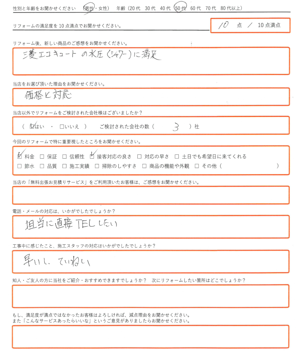 直筆のアンケートリフォーム情報施工日:2019年11月17日場所:神戸市リフォーム内容:電機温水器からエコキュートへ使用したモデル:お客様情報性別・年齢:男性(50代)リフォームの満足度10点/10点満点中アンケートの内 ...