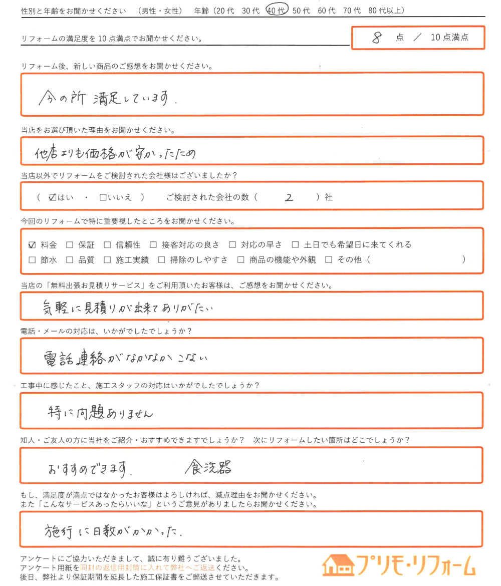 直筆のアンケートリフォーム情報施工日:2019年11月16日場所:たつの市リフォーム内容:エコキュート交換使用したモデル:お客様情報性別・年齢:(40代)リフォームの満足度8点/10点満点中アンケートの内容リフォーム後、 ...