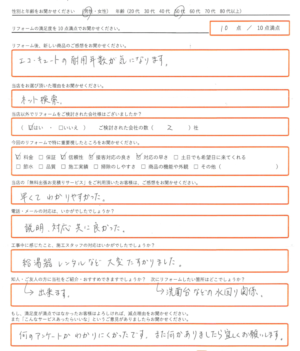 直筆のアンケートリフォーム情報施工日:2019年10月29日場所:岡山市リフォーム内容:エコキュート入替使用したモデル:お客様情報性別・年齢:男性(50代)リフォームの満足度10点/10点満点中アンケートの内容リフォーム ...