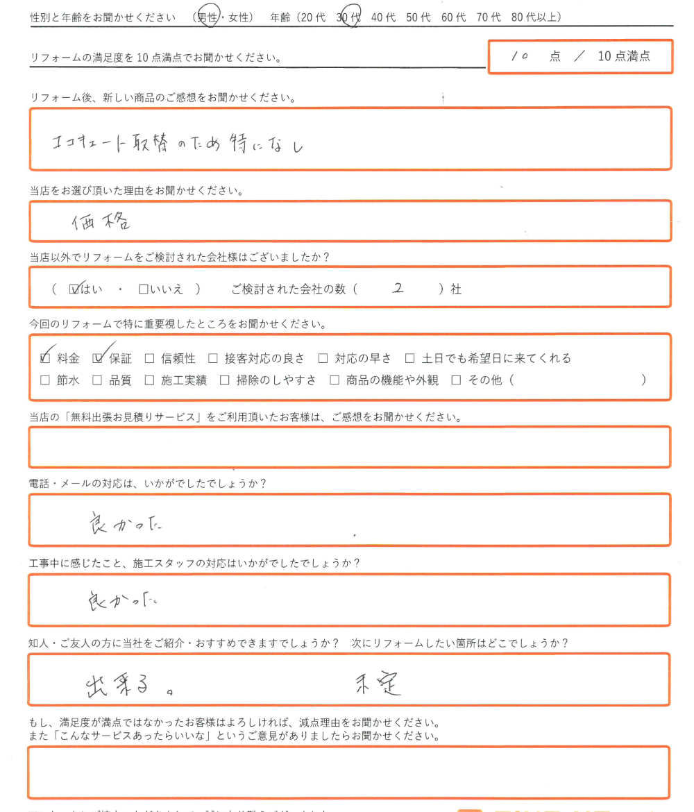 直筆のアンケートリフォーム情報施工日:2019年10月9日場所:姫路市リフォーム内容:エコキュート取替使用したモデル:お客様情報性別・年齢:男性(30代)リフォームの満足度10点/10点満点中直筆アンケートを拡大アンケー ...