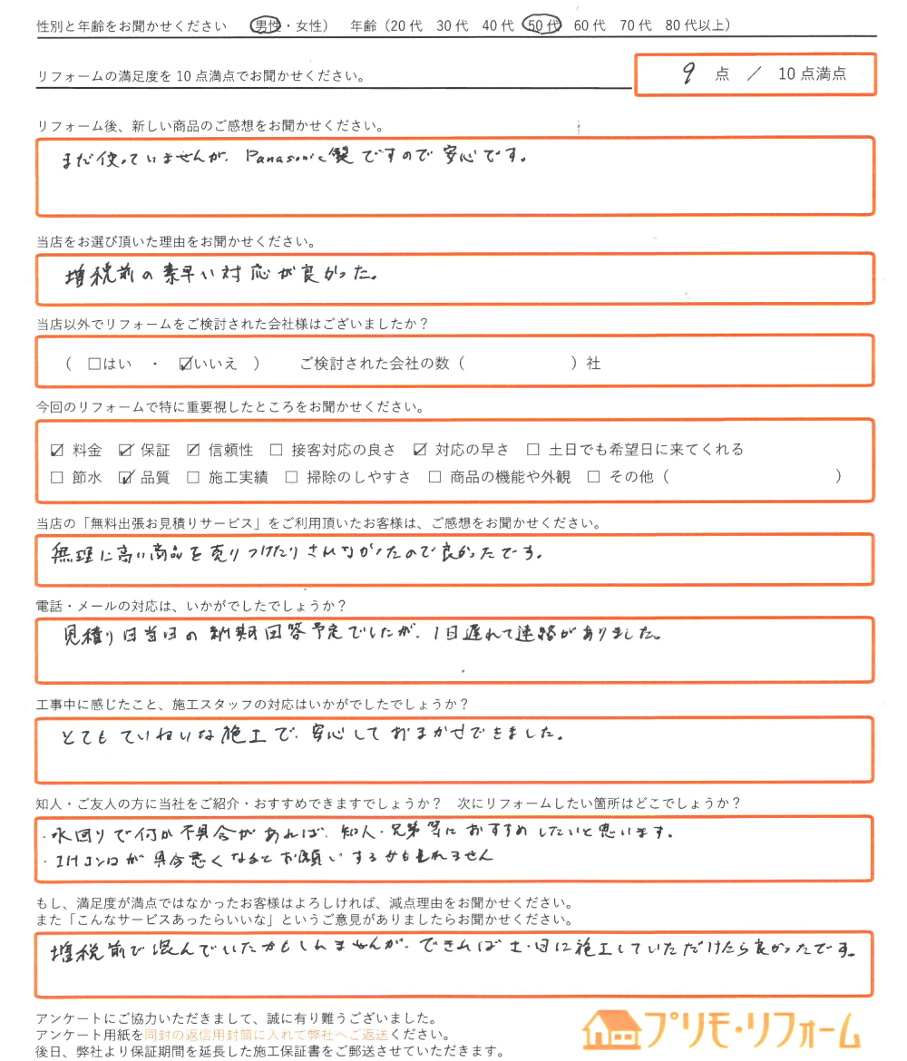 直筆のアンケートリフォーム情報施工日:2019年9月27日場所:神戸市リフォーム内容:エコキュート取替使用したモデル:お客様情報性別・年齢:男性(50代)リフォームの満足度9点/10点満点中アンケートの内容リフォーム後、 ...