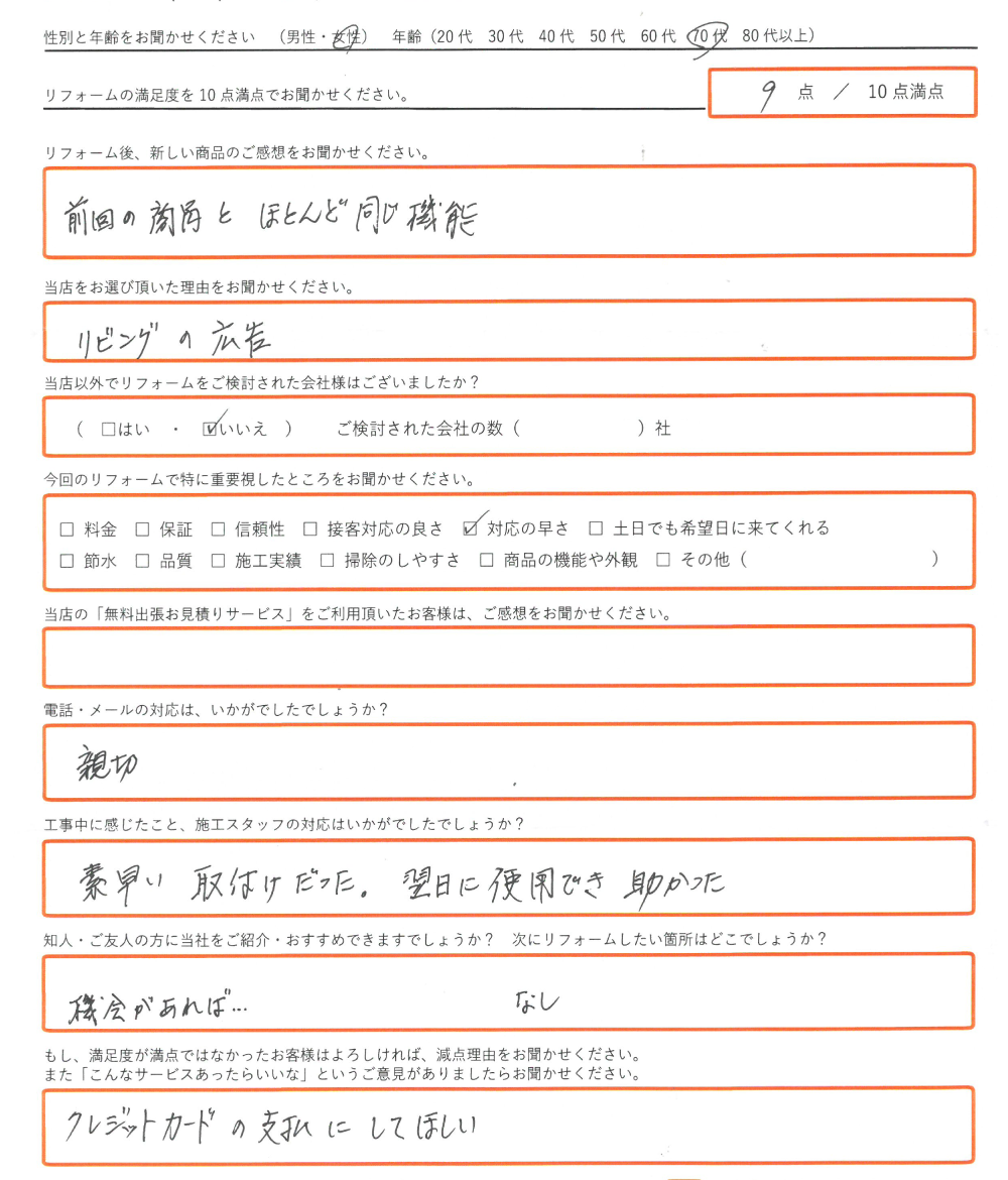 直筆のアンケートリフォーム情報施工日:2019年9月21日場所:姫路市リフォーム内容:エコキュート入替使用したモデル:お客様情報性別・年齢:女性(70代)リフォームの満足度9点/10点満点中アンケートの内容リフォーム後、 ...