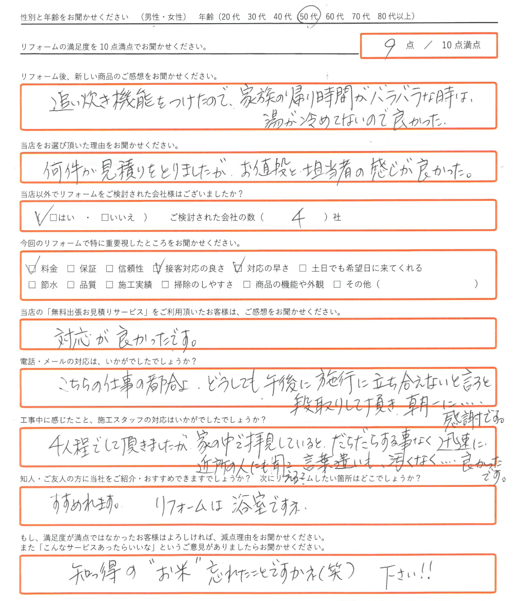 直筆のアンケートリフォーム情報施工日:2019年9月12日場所:神戸市リフォーム内容:電機温水器からエコキュートへ使用したモデル:お客様情報性別・年齢: (50代)リフォームの満足度9点/10点満点中直筆アンケートを拡 ...