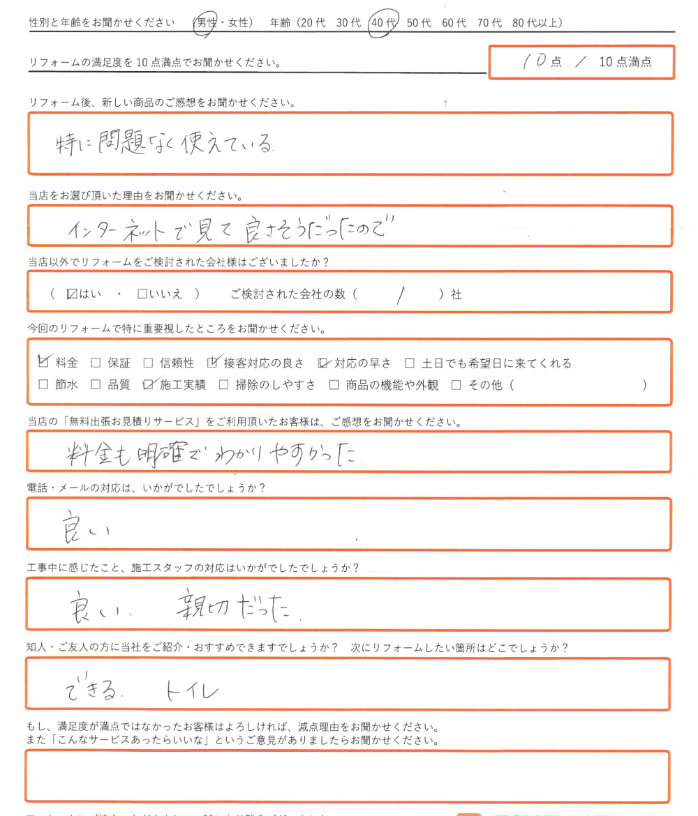 直筆のアンケートリフォーム情報施工日:2019年9月4日場所:たつの市リフォーム内容:エコキュート交換へ使用したモデル:お客様情報性別・年齢:男性(40代)リフォームの満足度10点/10点満点中直筆アンケートを拡大アンケ ...