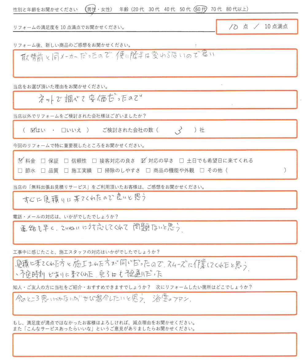 直筆のアンケートリフォーム情報施工日:2019年9月20日場所:姫路市リフォーム内容:電機温水器からエコキュートへ使用したモデル:お客様情報性別・年齢:男性(70代)リフォームの満足度10点/10点満点中直筆アンケートを ...