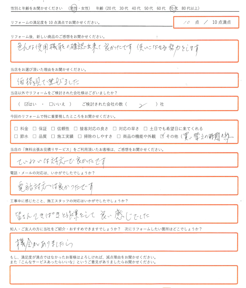 直筆のアンケートリフォーム情報施工日:2019年9月12日場所:神戸市リフォーム内容:エコキュート交換使用したモデル:お客様情報性別・年齢:男性(70代)リフォームの満足度10点/10点満点中アンケートの内容リフォーム後 ...