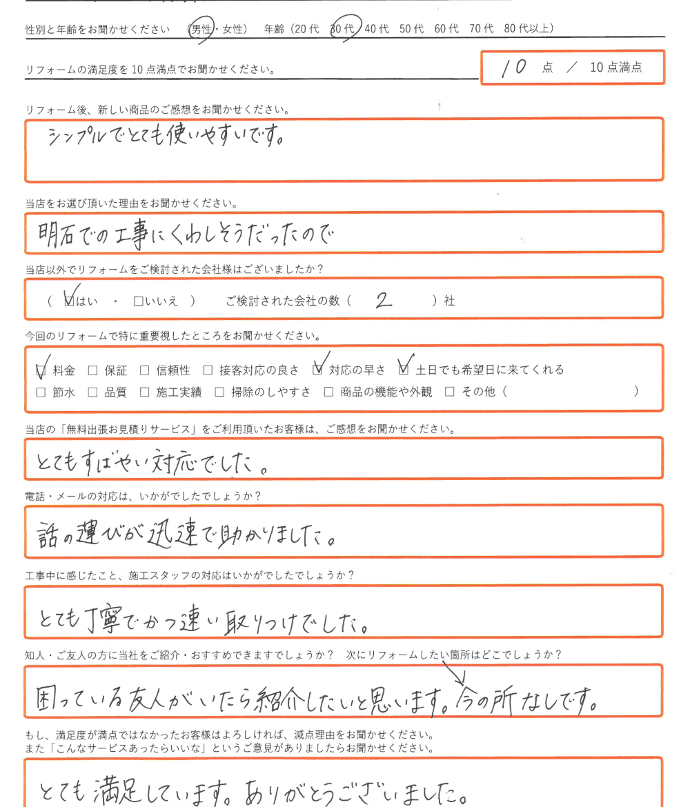 直筆のアンケートリフォーム情報施工日:2019年7月29日場所:明石市リフォーム内容:エコキュート入替使用したモデル:お客様情報性別・年齢:男性(30代)リフォームの満足度10点/10点満点中アンケートの内容リフォーム後 ...